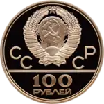 Зверху герб СРСР з 15 витками стрічки, ліворуч від нього літери «СС», праворуч «СР», нижче подвійна риса, під нею позначення номіналу монети цифра «100» і нижче слово «РУБЛЕЙ».