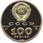 Зверху герб СРСР з 15 витками стрічки, під ним літери «СРСР», нижче ліворуч і праворуч риса, під рискою зліва хімічне позначення «Au» і проба «900» металу з якого зроблена монета, під ними чиста вага дорогоцінного металу «15,55», під рискою праворуч монограма монетного двору «ММД», нижче позначення вартості монети цифра «100» і нижче слово «РУБЛЕЙ», знизу у канта рік випуску монети «1989».