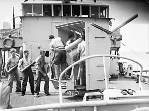 ![]() Обслуга 102-мм гармати QF 4 inch Mk XIX на австралійському корветі «Ковра» типу «Батерст». Війна на Тихому океані. Червень 1945 | |