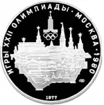 Зліва і зверху уздовж канта слова «ИГРЫ XXII ОЛИМПИАДЫ», праворуч розділені крапкою слово «МОСКВА» і рік проведення XXII Олімпіади «1980», вгорі емблема XXII Олімпійських ігор, в середині панорама Московського Кремля, під нею праворуч монограма монетного двору «ЛМД», внизу біля канта рік випуску монети «1977».