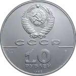 Зверху герб СРСР з 15 витками стрічки, під ним літери «СССР», нижче ліворуч і праворуч риса, під рискою зліва хімічне позначення «Pd» і проба «999» металу з якого зроблена монета, під ними чиста вага дорогоцінного металу «15,55», під рискою праворуч монограма монетного двору «ЛМД», нижче позначення номіналу монети цифра «10» і нижче слово «РУБЛЕЙ», знизу у канта рік випуску монети «1990».