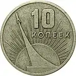 На реверсі монети, на тлі висхідного сонця, було зображено монумент на честь видатних досягнень радянського народу в освоєнні космосу. Цей монумент спорудили поруч з ВДНГ у листопаді 1964 року. Скульптор А. Файдиш-Рандієвський, архітектори М. Барщ і А. Колчін увінчали стометровий обеліск одинадцятиметровою моделлю космічної ракети. П'єдестали були оточені горельєфами, що розповідали про освоєння космічного простору.