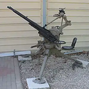 ![]() Зенітна кулеметна установка зі спареним 13,2-мм великокаліберним кулеметом Hotchkiss M1929 в Ізраїльському військовому музеї. Липень 2006 | |