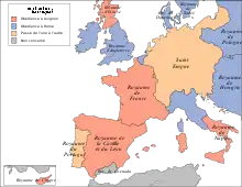 Майже весь Піренейський півострів займають християнські Кастилія і Леон, де править Енріке II (до 1379), Арагонське королівство та Португалія під правлінням Фернандо I (до 1383). Під владою маврів залишилися тільки землі на самому півдні.