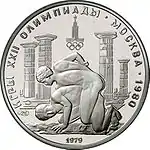 Зліва і зверху уздовж канта слова «ИГРЫ XXII ОЛИМПИАДЫ», праворуч розділені крапкою слово «МОСКВА» і рік проведення XXII Олімпіади «1980», зверху емблема XXII Олімпійських ігор, нижче сутичка стародавніх борців, за ними панорама руїн Олімпії, під руїнами зліва монограма монетного двору «ЛМД», внизу у канта рік випуску монети «1979».