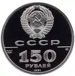 Зверху герб СРСР з 15 витками стрічки, під ним літери «СССР», нижче ліворуч і праворуч риса, під рискою зліва хімічне позначення «Pt» і проба «999» металу з якого зроблена монета, під ними чиста вага дорогоцінного металу «15,55», під рискою праворуч монограма монетного двору «ЛМД», нижче позначення номіналу монети цифра «150» і нижче слово «РУБЛЕЙ», знизу у канта рік випуску монети «1991».