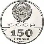 Зверху герб СРСР з 15 витками стрічки, під ним літери «СССР», нижче ліворуч і праворуч риса, під рискою зліва хімічне позначення «Pt» і проба «999» металу з якого зроблена монета, під ними чиста вага дорогоцінного металу «15,55», під рискою праворуч монограма монетного двору «ЛМД», нижче позначення номіналу монети цифра «150» і нижче слово «РУБЛЕЙ», знизу у канта рік випуску монети «1989».