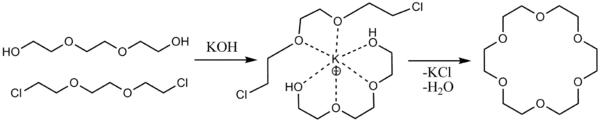 18-краун-6 етер отримують з великим виходом при олігомеризації етилен оксиду в присутності йонів Калію, які виконують роль темплату.