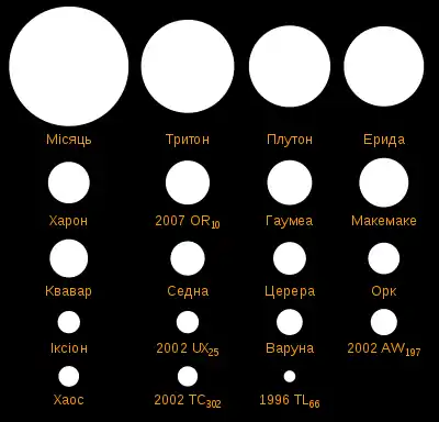Порівняння розмірів Місяця та декількох крупних ТНО, серед яких Хаос