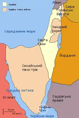 Територія, яка була під контролем Ізраїлю до та після Шестиденної війни - 8 червня року повітряними та морськими силами Ізраїля заатакований американський корабель «ЮСС Либерті»(USS Liberty) у Середземному морі, який спостерігав за воєнними діями в регіоні. Загинуло 37,отримали поранення 173 американця. В офіційному пробаченні Ізраїль зазначив, що судно було прийнято за єгипетське.