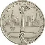 На монеті зображено факел XXII Олімпіади у Москві. Олімпійський факел — один із символів Олімпійських ігор. Цей вогонь запалюють в місті проведення Ігор під час їх відкриття, і він горить безперервно до їх закінчення. Відродження заснованої на давньогрецьких ритуалах традиції відбулося при проведенні Олімпійських ігор 1928 року в Амстердамі на Олімпійському стадіоні, за проект якого голландський архітектор Ян Вілс був нагороджений золотою медаллю на конкурсі мистецтв. Вогонь горів і на стадіоні Ігор у Лос-Анджелесі в 1932 році. Під час Олімпійських ігор 1936 року в Берліні вперше була проведена естафета Олімпійського вогню. Понад 3000 бігунів брали участь у доставці факела з Олімпії в Берлін. На зимових Олімпійських іграх вогонь запалювався і в 1936, і в 1948 році, але естафета вперше була проведена в 1952 році перед зимовими Олімпійськими іграми в Осло, причому брала початок не в Олімпії, а в Моргедале. Зазвичай запалення вогню довіряють відомій людині, частіше за все, спортсмену, хоча бувають і винятки. Вважається великою честю бути обраним для проведення цієї церемонії.