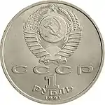 У верхній частині диска — Державний герб Союзу Радянських Соціалістичних Республік (являє собою зображення серпа і молота на фоні земної кулі, в променях сонця і в обрамленні колосся, перев'язаних п'ятнадцятьма витками стрічки); під гербом — напис «СССР», знизу — велика стилізована цифра «1», під нею — півколом розміщено слово «РУБЛЬ» ще нижче уздовж канта знаходиться дата випуску монети — «1991».