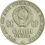 Герб СРСР з п'ятнадцятьма витками стрічки, ліворуч від герба — літери «СС», праворуч «СР», під гербом номінал монети «ОДИН РУБЛЬ», по колу є напис «СТО ЛЕТ СО ДНЯ РОЖДЕНИЯ В. И. ЛЕНИНА».