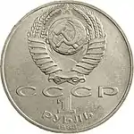 У верхній частині монети розміщено герб СРСР, під гербом напис «СССР», ще нижче у два рядки вказаний номінал монети — «1 РУБЛЬ». Напис «РУБЛЬ» — напівкруглий. Ще нижче півколом розміщено рік карбування монети — «1988».