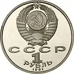 У верхній частині диска — Державний герб Союзу Радянських Соціалістичних Республік (являє собою зображення серпа і молота на фоні земної кулі, в променях сонця і в обрамленні колосся, перев'язаних п'ятнадцятьма витками стрічки); під гербом — напис «СССР», знизу — велика стилізована цифра «1», під нею — півколом розміщено слово «РУБЛЬ» ще нижче уздовж канта знаходиться дата випуску монети — «1991».