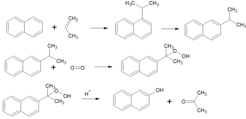 Також отримують окисненням 2-ізопропілнафталену, який отримують ізомеризацією 1-ізопропілнафталену. Спочатку утоврюється гідропероксид, який далі розпадається на 2-нафтол та ацетон[3]: