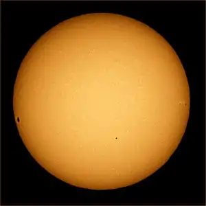 Проходження Меркурія по диску Сонця (маленька чорна точка нижче і трохи праворуч від центру) по диску Сонця 8 листопада 2006 року. Видно сонячні плями