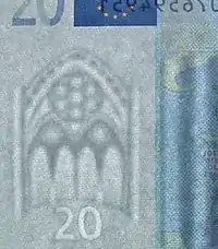 Всі банкноти євро містять зображення мостів та арок/дверних прорізів різних історичних стилів європейської архітектури. Двадцять євро відображає архітектурні елементи доби готики (13-14 століття н. е.). Хоча Роберт Каліна розробив оригінальні малюнки реально існуючих будівель, з політичних причин вирішено розмістити схематичні приклади відповідних архітектурних епох.