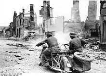 ![]() Німецькі мотоциклетні частини на вулицях розбомбленого французького міста. Травень 1940 | |