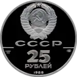 Зверху герб СРСР з 15 витками стрічки, під ним літери «СССР», нижче ліворуч і праворуч риса, під рискою зліва хімічне позначення «Pd» і проба «999» металу з якого зроблена монета, під ними чиста вага дорогоцінного металу «31,1», під рискою праворуч монограма монетного двору «ЛМД», нижче позначення номіналу монети цифра «25» і нижче слово «РУБЛЕЙ», знизу у канта рік випуску монети «1988».