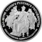 Ліворуч, зверху і праворуч уздовж канта монети слова «500-ЛЕТИЕ ЕДИНОГО РУССКОГО ГОСУДАРСТВА», в середині Іван III великий князь Московський на троні з палицею, за ним свита, придворні князі, знизу уздовж канта слова «ИВАН III ОСНОВАТЕЛЬ ЕДИНОГО ГОСУДАРСТВА».