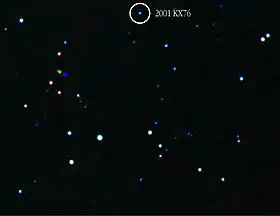 - Marsden, Brian G. (2001-07-01). «MPEC 2001-N01: 2001 FT185, 2001 KW76, 2001 KX76, 2001 KY76, 2001 KZ76, 2001 KA77». IAU Minor Planet Center. Harvard-Smithsonian Center for Astrophysics. Retrieved 2010-01-06.