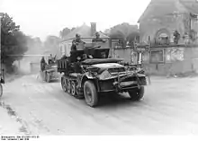 ![]() Підрозділ зенітних військ на напівгусеничних тягачах Sd.Kfz 10 з 20-мм зенітними гарматами 20-мм FlaK 30/38 просувається по французькому селу. Французька кампанія. Травень 1940 | |