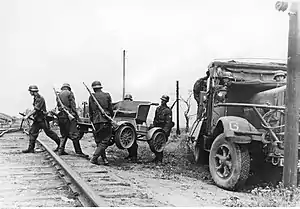 ![]() Німецькі солдати перевантажують дрезину на залізницю | |
