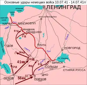 12 липня німецькі війська зіткнулися з частинами прикриття Лузького оборонного рубежу в районі річки Плюсса і в ході запеклих боїв були зупинені. Німецький наступ на Ленінград призупинився на цілий місяць. Для прориву Лузького оборонного рубежу командування групи армій «Північ» утворило три ударні угруповання військ. XXXXI-й моторизований корпус (1-ша, 6-та, 8-ма танкові, 36-та моторизована та 1-ша піхотна дивізії) з XXXVIII-м армійським корпусом (58-ма піхотна дивізія) увійшли до Північного ударного угруповання генерал-полковника Е.Гепнера за підтримки з повітря 1-го повітряного корпусу генерала авіації Г. Форстера, діяв із захоплених плацдармів Іванівське та Сабськ на річці Луга у напрямку через Копорське плато на Ленінград з заходу.