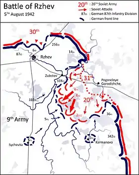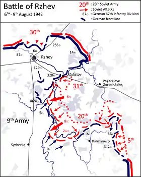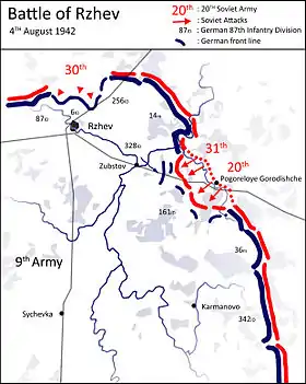 | серпень | XXXXVI-й тк | 9-та армія | Група армій «Центр» | Карманово |