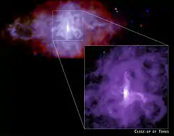 ![]() Рентгенівське зображення 3C58 рентгенівським телескопом Чандра. Виноска показує внутрішню туманність у формі тора | |