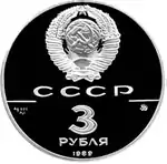 Зверху герб СРСР з 15 витками стрічки, під ним літери «СССР», нижче ліворуч і праворуч риса, під рискою зліва хімічне позначення «Ag» і проба «900» металу з якого зроблена монета, під ними чиста вага дорогоцінного металу «31,1», під рискою праворуч монограма монетного двору «ММД», нижче позначення номіналу монети цифра «3» і нижче слово «РУБЛЯ», знизу у канта рік випуску монети «1989».