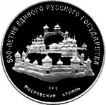 Ліворуч, зверху і праворуч уздовж канта монети слова «500-ЛЕТИЕ ЕДИНОГО РУССКОГО ГОСУДАРСТВА», в середині панорамний вид на Московський Кремль, нижче цифра «XV в.», знизу уздовж канта слова «МОСКОВСКИЙ КРЕМЛЬ».