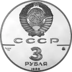 Зверху герб СРСР з 15 витками стрічки, під ним літери «СССР», нижче ліворуч і праворуч риса, під рискою зліва хімічне позначення «Ag» і проба «900» металу з якого зроблена монета, під ними чиста вага дорогоцінного металу «31,1», під рискою праворуч монограма монетного двору «ММД», нижче позначення номіналу монети цифра «3» і нижче слово «РУБЛЯ», знизу у канта рік випуску монети «1989».