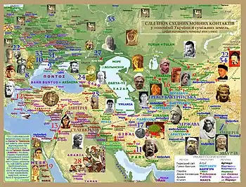 При цьому істотно більше порівняно з іншими мовами число іншомовних пластів у словнику, топонімії, прізвищах українців є прямим наслідком двохтисячолітнього існування наших предків у Наддніпрянщині біля шляхів, або на самих шляхах етнічних міграцій з Азії. Це стає помітним при зіставленні з історією контактів мов островів чи гірських долин. Так, алеутська мова має ознаки 5 мовних епох контактів з мовами сусідніх народів (у її словнику є запозичення з ескімоських, атапаських, коряцької, російської, англійської мов). Японці прожили шість своїх епох мовних контактів, ірландці – сім. Малагасійська мова на Мадагаскарі також зберігає мовний слід 6-7 епох свого розвитку (2-3 мовні пласти, завезені першими мовцями з малайських мов, африканський мовний субстрат, арабські, французькі й англійські запозичення). За час своїх мандрів з Індії до Європи синти (цигани Ломбардії) також пережили 9 мовних епох. Вірменська береже мовні свідчення про 10 епох (питомий фракійський фонд, урартійський субстрат, давньоперські, сирійські, грецькі, новоперські, арабські, турецькі, французькі, англійські запозичення). Баски також мають 10 іншомовних пластів у своєму словнику, галісійці й іспанці – по 14[31].