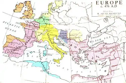 Кінець Західної Римської імперії. Початок Середньовіччя. У Східній Римській імперії відновилося правління Флавія Зенона. У Європі утворилися численні варварські держави, зокрема в Італії править Одоакр, Іберію південь Галлії займає Вестготське королівство, Північну Африку захопили вандали, утворивши Африканське королівство, у Тисо-Дунайській низовині утворилося Королівство гепідів. На півночі Галлії правлять римо-галли, ще північніше — салічні франки. Остготи займають Мезію, Македонію і Фракію.