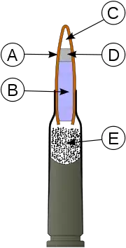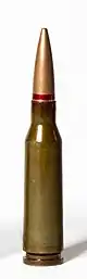 Штатно набій споряджають цільнооболонковою кулею. Усередині стандартної кулі міститься серцевина з м'якої сталі, покрита оболонкою з мідного сплаву. Гільза набою пляшкової форми, з кільцевою проточкою біля основи, без виступу фланця.