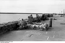 ![]() Німецька піхота на вогневих позиціях поздовж причальної стінки морського порту. Окупована північна Франція. 1942 | |