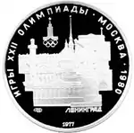 Зліва і зверху уздовж канта слова «ИГРЫ XXII ОЛИМПИАДЫ», праворуч розділені крапкою слово «МОСКВА» і рік проведення XXII Олімпіади «1980», угорі ліворуч емблема XXII Олімпійських ігор, у середині панорама Ленінграда, під нею зліва монограма монетного двору «ЛМД», знизу біля канта рік випуску монети «1977».