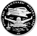 Зліва і зверху уздовж канта слова «ИГРЫ XXII ОЛИМПИАДЫ», праворуч розділені крапкою слово «МОСКВА» і рік проведення XXII Олімпіади «1980», зверху плавальний басейн «Олімпійський», нижче плавець, під ним зліва емблема XXII Олімпійських ігор, праворуч монограма монетного двору «ЛМД», внизу у канта рік випуску монети «1978».