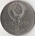 У верхній частині диска — Державний герб Союзу Радянських Соціалістичних Республік (являє собою зображення серпа і молота на фоні земної кулі, в променях сонця і в обрамленні колосся, перев'язаних п'ятнадцятьма витками стрічки); під гербом — напис «СССР», знизу — велика цифра «5», під нею — півколом розміщено слово «РУБЛЕЙ» ще нижче уздовж канта знаходиться дата випуску монети — «1990».