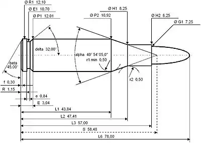 7×57mmR параметри набою. Всі розміри в міліметрах (мм).[12]