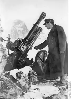 ![]() Ведення вогню з 75-мм гірської гармати GebH 36 у ході Кавказької кампанії. Німецько-радянська війна. Січень 1943 | |