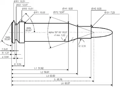 | Діаметр фланця гільзи, мм: | ,532 in (13,5 mm) | |||||||||||||||||||||||