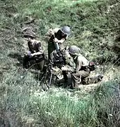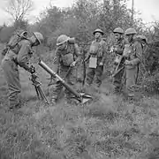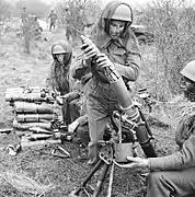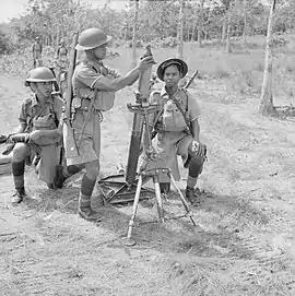 ![]() Британські мінометники ведуть вогонь з 81-мм міномету ML 3 inch. Малайська операція. 1941 | |