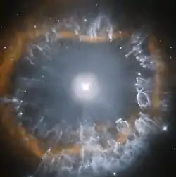 На світлині вибуху AG Carinae видно викид розпечених матеріалів назовні — вони нагадують сітківку ока довкола зіниці. Цей вибух стався близько 10 тис. років тому. Різні форми й вигини зоряного пилу формує зоряний вітер, видкість якого повинна дорівнювати близько 1 000 000 км/год. Невдовзі, за прогнозами науковців, AG Carinae зазнає ще кілька подібних вибухів і з моментом виснаження всіх запасів водню в її ядрі, вона, швидше за все, перетвориться на наднову.[1]