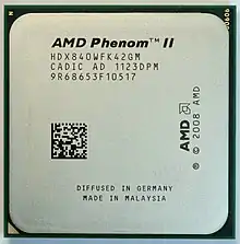 AMD Phenom II — сімейство багатоядерних процесорів компанії AMD, які виготовлені за 45 нм технологічним процесом, і базуються на AMD K10 мікроархітектурі, в свою чергу є наступниками процесорної лінійки Phenom. Процесор Phenom II версії Socket AM2+ був випущений в грудні 2008, а версія для Socket AM3, з підтримкою DDR3, їхня перша партія (трьох- і чотирьохядерні) була випущена 9 лютого 2009.[1] Для створення двопроцесорної системи потрібен Socket F+, який є основою платформи AMD Quad FX.[2] Процесори Phenom II X6 наступного покоління були представлені 27 квітня 2010 року.[3] [4]