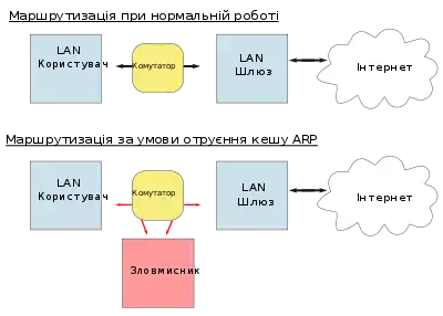 У галузі комп'ютерних мереж, ARP spoofing (ARP cache poisoning або ARP poison routing) — мережева атака канального рівня, при якій зловмисник надсилає підроблені повідомлення протоколу ARP (Address Resolution Protocol) в локальну мережу.[1]. За допомогою ARP spoofing зловмисник посилає підроблене ARP повідомлення на локальну мережу. Зазвичай мета полягає в тому, щоб зв'язати MAC-адресу зловмисника з IP-адресою хоста на який здійснюється атака, зазвичай це основний шлюз, щоб трафік замість цієї IP-адреси, був надісланий зловмиснику.
