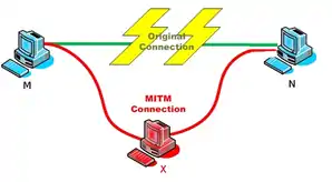 - Починає виконуватися атака ARP spoofing та всі пакети між М та N проходить через X. Наприклад, якщо М хоче передати пакет комп'ютеру N, то М дивиться в свою ARP-таблицю, знаходить запис IP-адреси вузла N, бере звідти MAC-адресу та передає пакет. Пакет знаходиться в інтерфейсі Х, аналізується, після чого перенаправляється до вузла N.