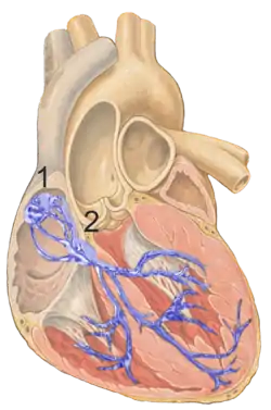 | Система проведення збудження (схематично, у людей) 1 синусовий вузол - 2 АВ вузол |